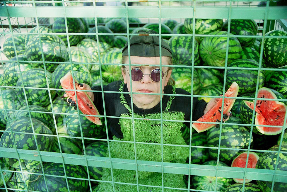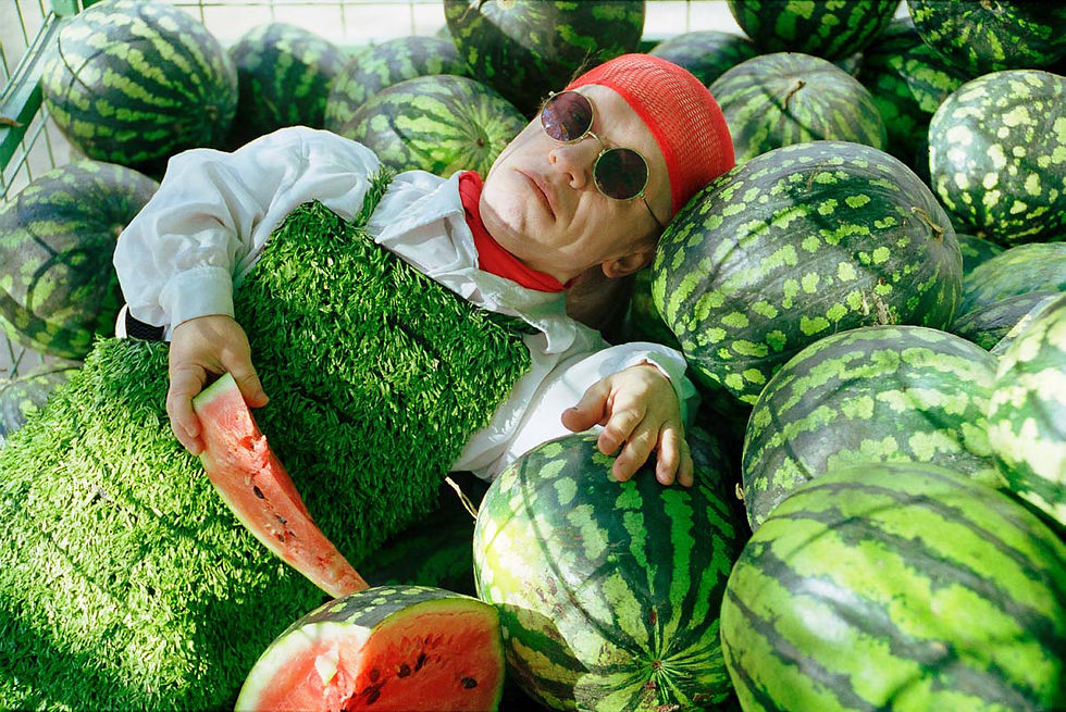 The series «Red lunch» has arisen as dedication to the romance "Naked lunch" by William S. Burroughs and also includes analog photos and digital collages on their basis. The primary push has been given at water-melon purchase in fine hot August day when the enormous quantity of the wasps who have gathered seriously to compete for possession by these fine fruits has started to frighten off buyers. In a pointed manner cut water-melons and all the system of their street sale with the trellised cages twined artificial garlands and closely hammered water-melons with wasps teeming on them sending to "Metropolis" by F.Lang and “La Grand Bouffe” by М.Ferrary represented remarkable multilevel structure of the consumption. The competition for carbohydrates between consumers of so various weight and food strategy has pushed to the game in scales resulted still in «Gulliver's Adventures» - to the conflict between the little man and the big wasps. The invoice of water-melons with their complementary colors-external camouflage green and predatory internal red-in interaction with warning black-yellow strips of wasps has led to modeling of a certain micropolis-laboratory with the power interchange system and schemes of movings. This series includes 38 photos and can be presented as in traditional hanging or can be placed on vertical extensions in a trellised cage for melon and gourds sale together with some quantity of water-melons.